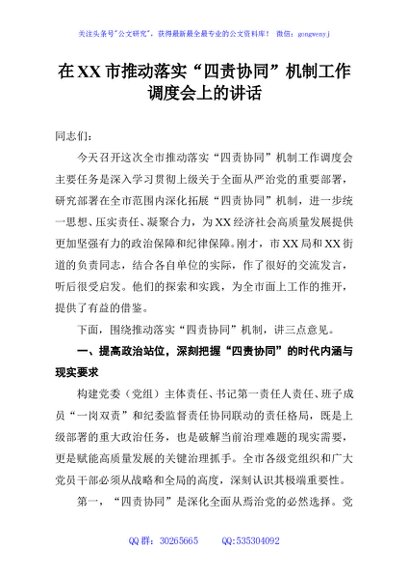 / 在XX市推动落实“四责协同”机制工作调度会上的讲话