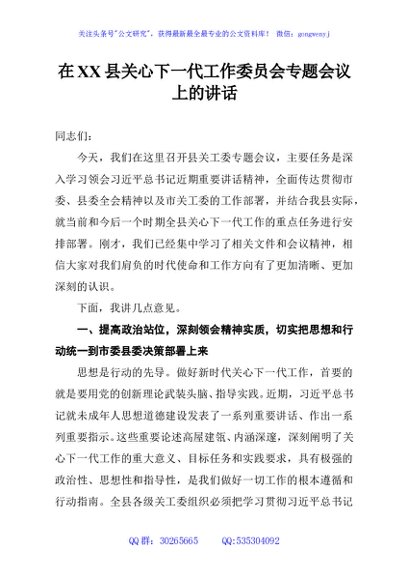 / 在XX县关心下一代工作委员会专题会议上的讲话