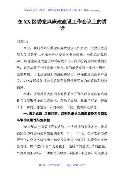 / 在XX区委党风廉政建设工作会议上的讲话