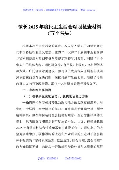 / 镇长2025年度民主生活会对照检查材料(五个带头)