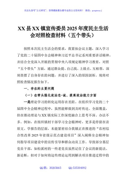 / XX县XX镇宣传委员2025年度民主生活会对照检查材料(五个带头)