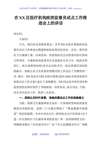 / 在XX区医疗机构疾控监督员试点工作推进会上的讲话