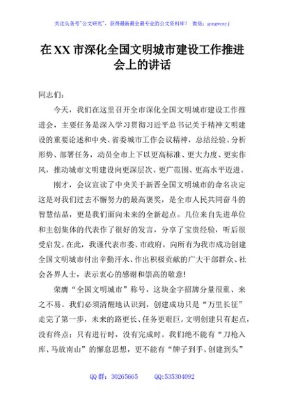 / 在XX市深化全国文明城市建设工作推进会上的讲话