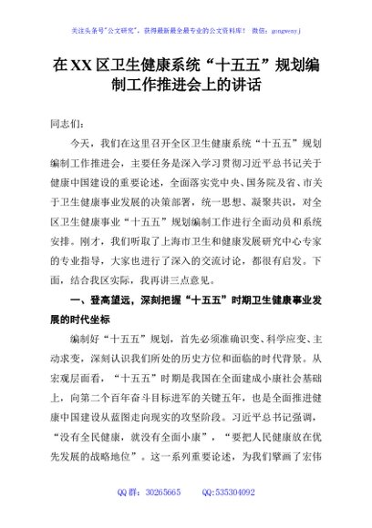 / 在XX区卫生健康系统“十五五”规划编制工作推进会上的讲话