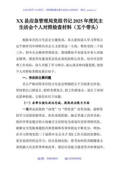 / XX县应急管理局党组书记2025年度民主生活会个人对照检查材料(五个带头)