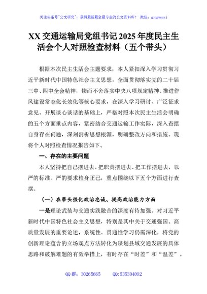 / XX交通运输局党组书记2025年度民主生活会个人对照检查材料(五个带头)