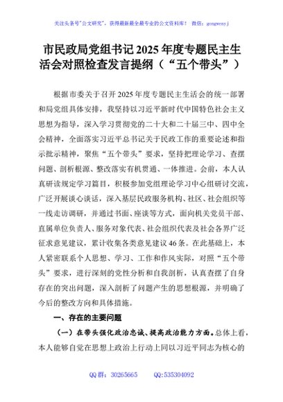 / 市民政局党组书记2025年度专题民主生活会对照检查发言提纲(“五个带头”)