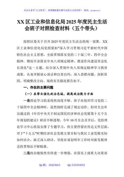 / XX区工业和信息化局2025年度民主生活会班子对照检查材料(五个带头)
