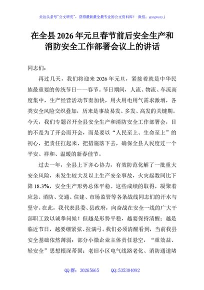 / 在全县2026年元旦春节前后安全生产和消防安全工作部署会议上的讲话