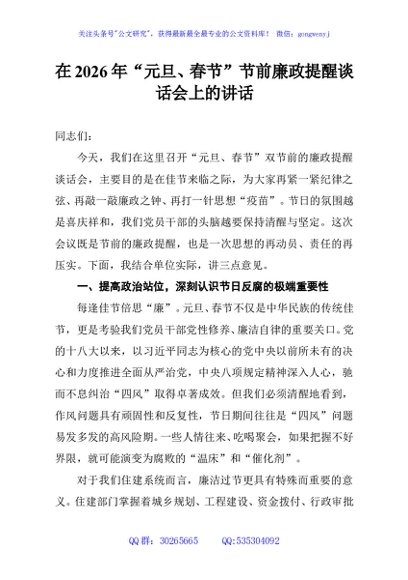 / 在2026年“元旦、春节”节前廉政提醒谈话会上的讲话