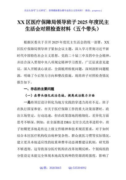 / XX区医疗保障局领导班子2025年度民主生活会对照检查材料(五个带头)