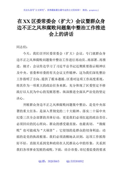 / 在XX区委常委会(扩大)会议暨群众身边不正之风和腐败问题集中整治工作推进会上的讲话