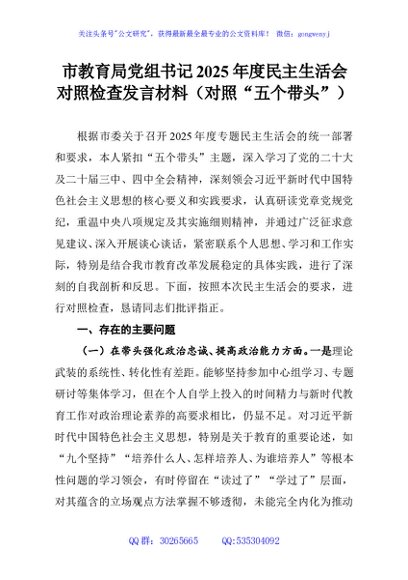 / 市教育局党组书记2025年度民主生活会对照检查发言材料(对照“五个带头”)