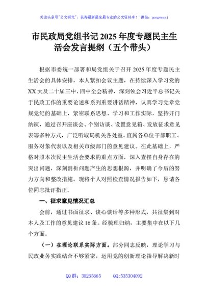 / 市民政局党组书记2025年度专题民主生活会发言提纲(五个带头)