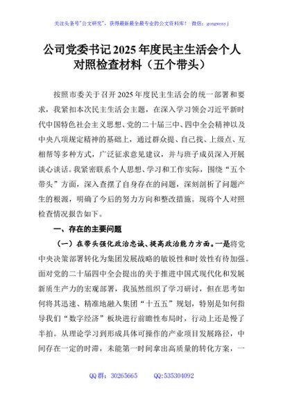 / 公司党委书记2025年度民主生活会个人对照检查材料(五个带头)