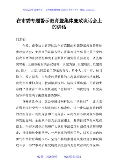 / 在市委专题警示教育暨集体廉政谈话会上的讲话