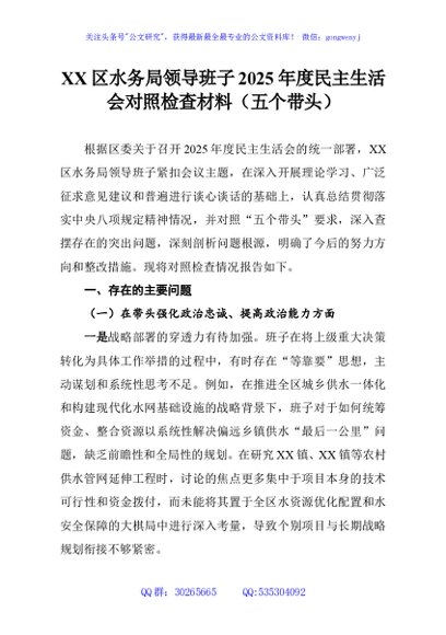/ XX区水务局领导班子2025年度民主生活会对照检查材料(五个带头)