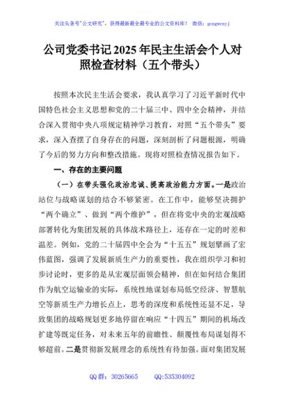 / 公司党委书记2025年民主生活会个人对照检查材料(五个带头)