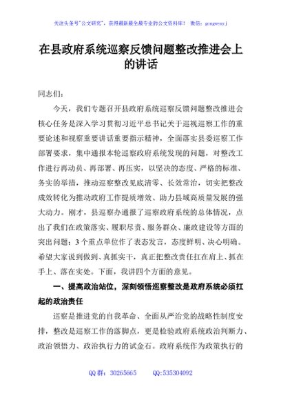 / 在县政府系统巡察反馈问题整改推进会上的讲话
