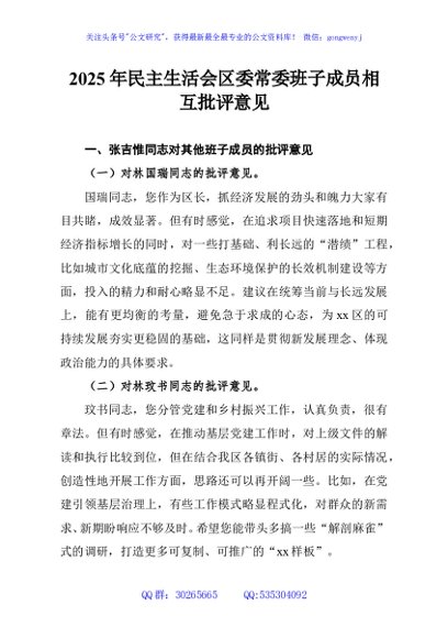 / 2025年民主生活会区委常委班子成员相互批评意见