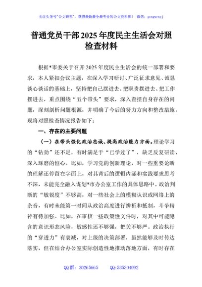 / 普通党员干部2025年度民主生活会对照检查材料