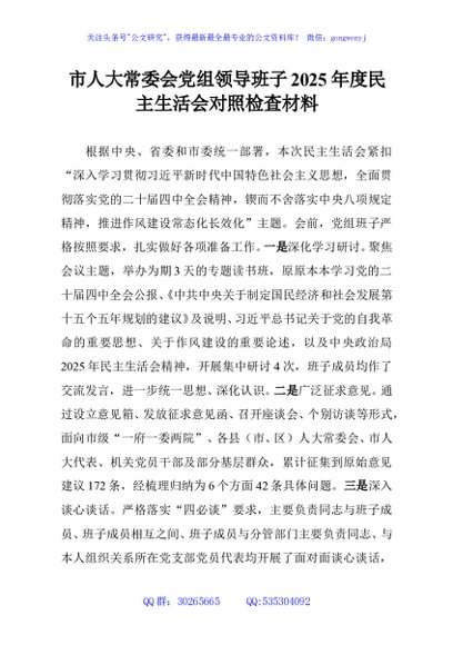 / 市人大常委会党组领导班子2025年度民主生活会对照检查材料
