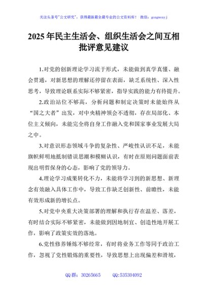 / 2025年民主生活会、组织生活会之间互相批评意见建议
