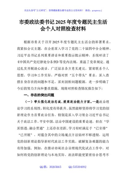 / 市委政法委书记2025年度专题民主生活会个人对照检查材料