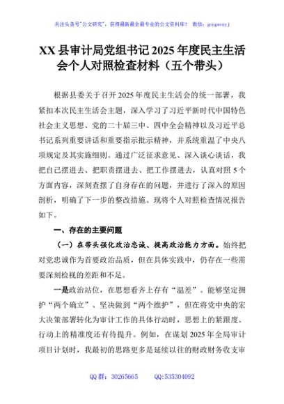 / XX县审计局党组书记2025年度民主生活会个人对照检查材料(五个带头)