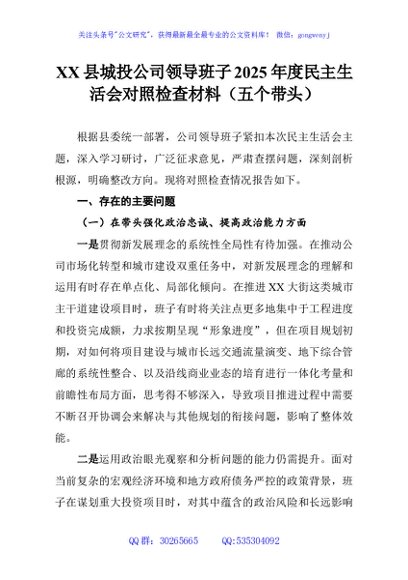 / XX县城投公司领导班子2025年度民主生活会对照检查材料(五个带头)