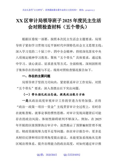 / XX区审计局领导班子2025年度民主生活会对照检查材料(五个带头)