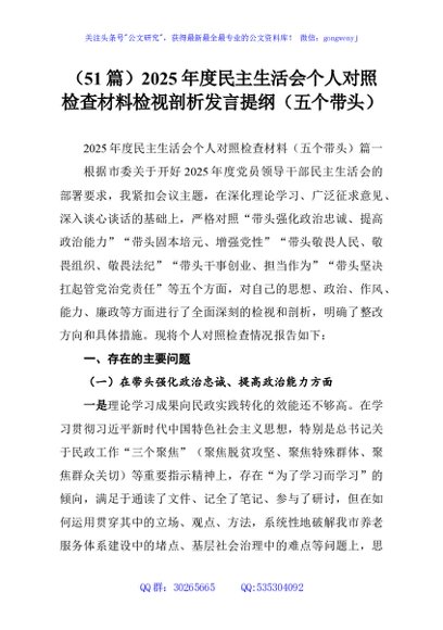 / (51篇)2025年度民主生活会个人对照检查材料检视剖析发言提纲(五个带头)