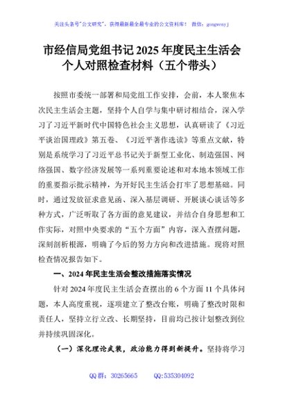 / 市经信局党组书记2025年度民主生活会个人对照检查材料(五个带头)