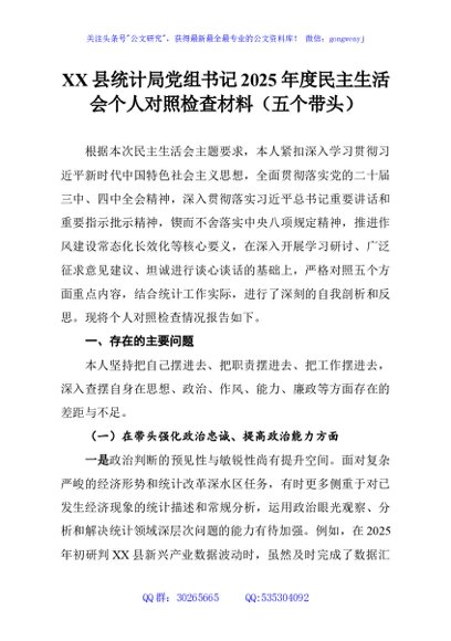 / XX县统计局党组书记2025年度民主生活会个人对照检查材料(五个带头)