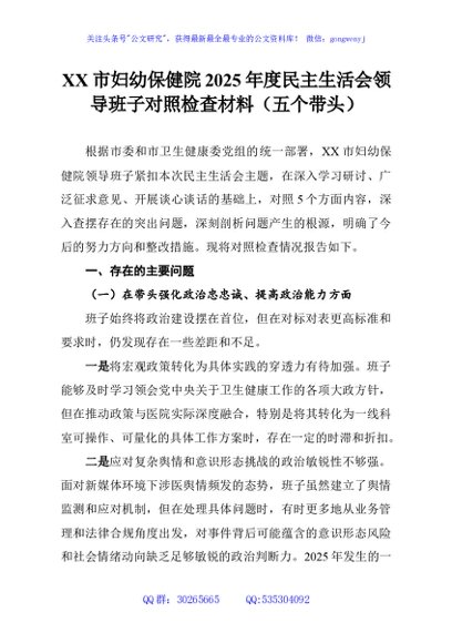 / XX市妇幼保健院2025年度民主生活会领导班子对照检查材料(五个带头)