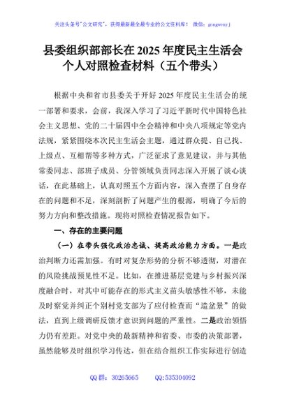 / 县委组织部部长在2025年度民主生活会个人对照检查材料(五个带头)
