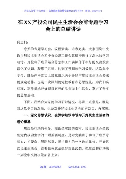 / 在XX产投公司民主生活会会前专题学习会上的总结讲话