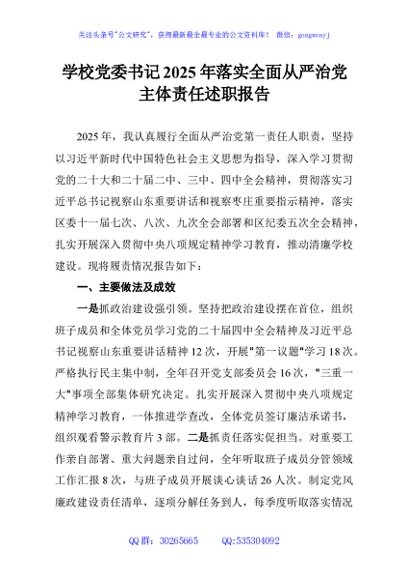 / 学校党委书记2025年落实全面从严治党主体责任述职报告
