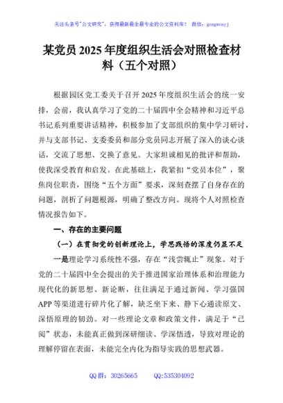/ 某党员2025年度组织生活会对照检查材料(五个对照)