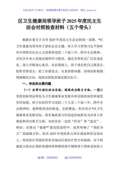 / 区卫生健康局领导班子2025年度民主生活会对照检查材料(五个带头)