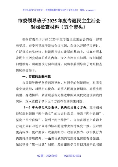/ 市委领导班子2025年度专题民主生活会对照检查材料(五个带头)