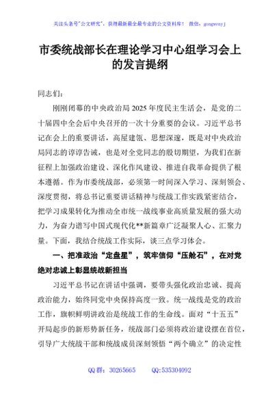/ 市委统战部长在理论学习中心组学习会上的发言提纲