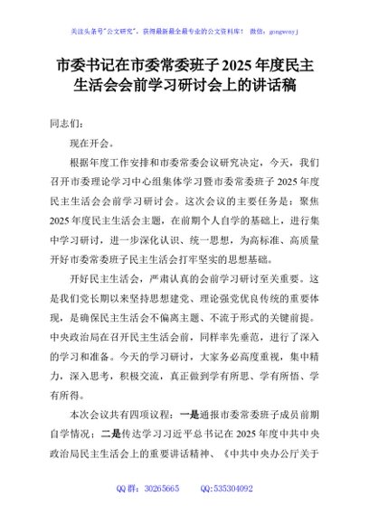 / 市委书记在市委常委班子2025年度民主生活会会前学习研讨会上的讲话稿