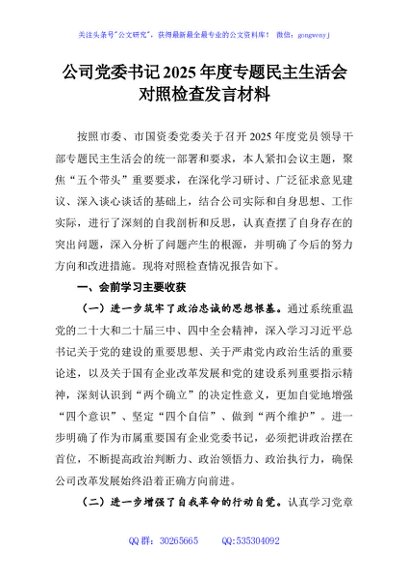 / 公司党委书记2025年度专题民主生活会对照检查发言材料