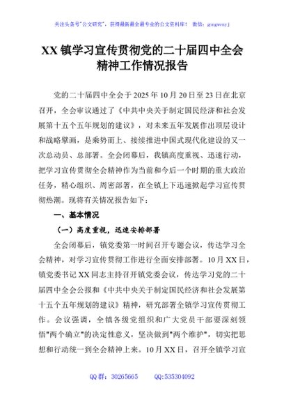 / XX镇学习宣传贯彻党的二十届四中全会精神工作情况报告