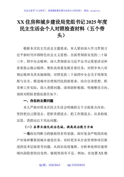 / XX住房和城乡建设局党组书记2025年度民主生活会个人对照检查材料(五个带头)