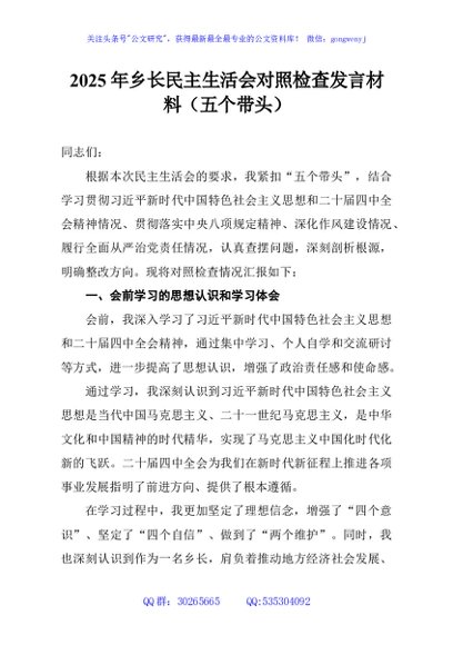 / 2025年乡长民主生活会对照检查发言材料(五个带头)