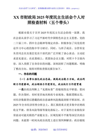 / XX市财政局2025年度民主生活会个人对照检查材料(五个带头)