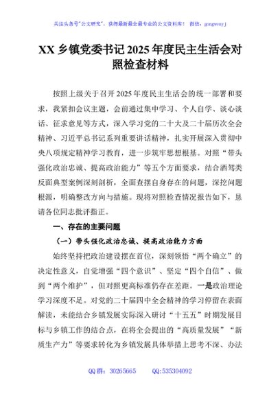 / XX乡镇党委书记2025年度民主生活会对照检查材料