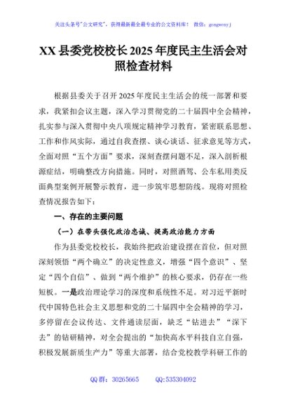 / XX县委党校校长2025年度民主生活会对照检查材料